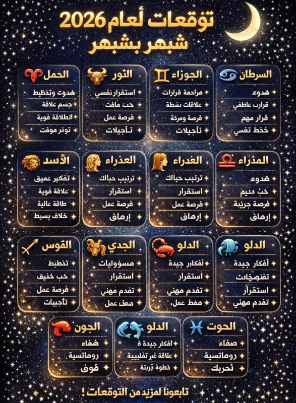 توقعات الأبراج لعام 2026 بشكل عام ومختصر، مع لمسة واقعية :