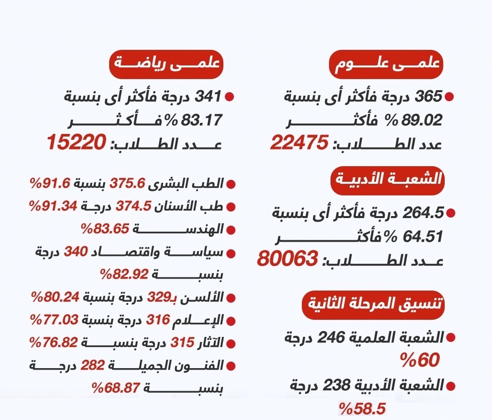 نتيجة تنسيق المرحلة الأولى 2022.. 91.6 % حد أدنى للقبول بالطب البشرى و91.34% للأسنان.. 82.92% لسياسة واقتصاد و77.83% للإعلام.. والمرحلة الثانية تبدأ غدا بحد أدنى 246 درجة للعلمى و238 للأدبى